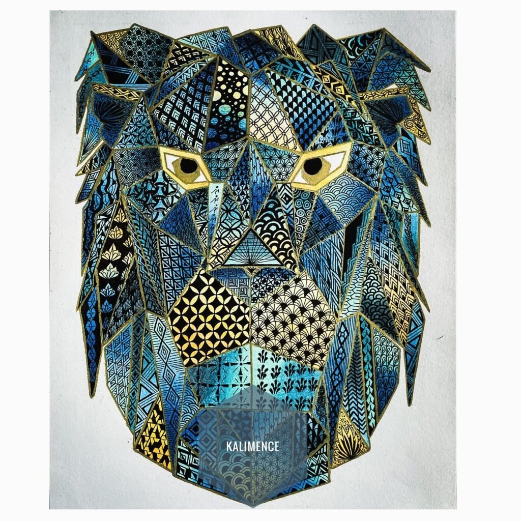Lion géométrique bleu jaune dessin stylo crayon de couleurs